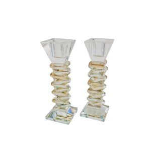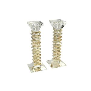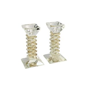 CRYSTAL/GOLD SPOOL SQUARE PAIR CANDLESTICKS 15 CM.