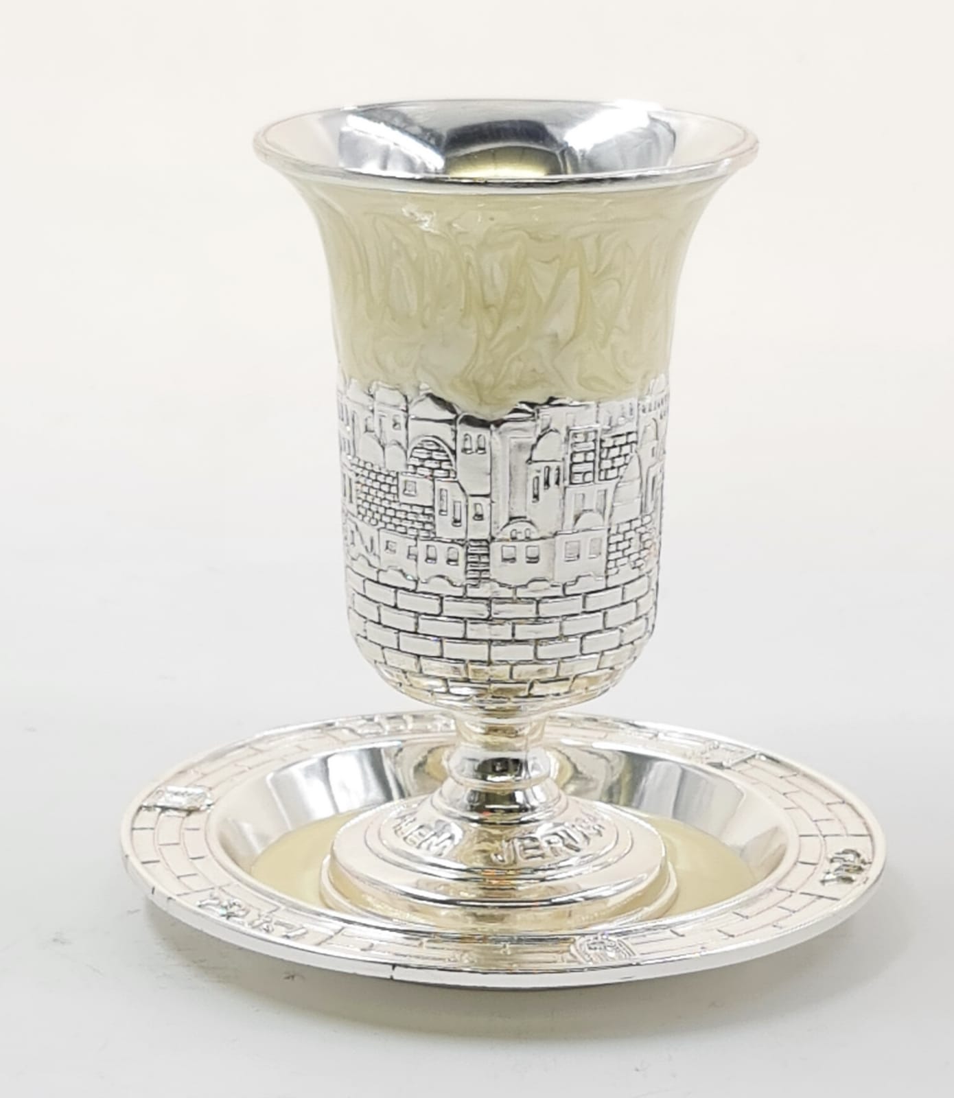 SILVER PLATED/ENAMEL JERUSALEM KIDUSH CUP/STEM/SAUCER