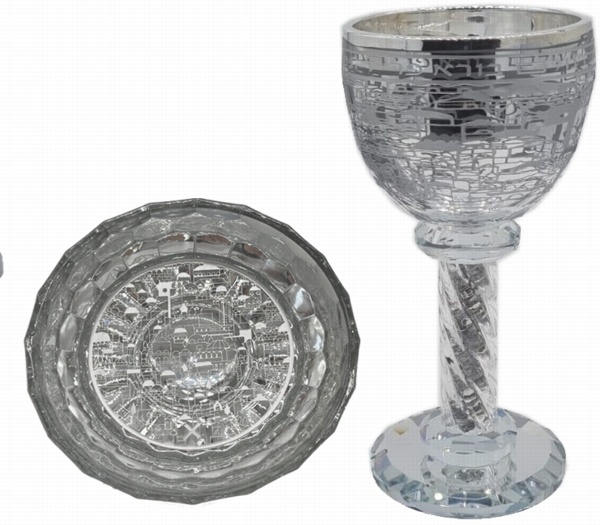 CRYSTAL/SILVER COATING JERUSALEM KIDUSH CUP/STEAM/SAUCER