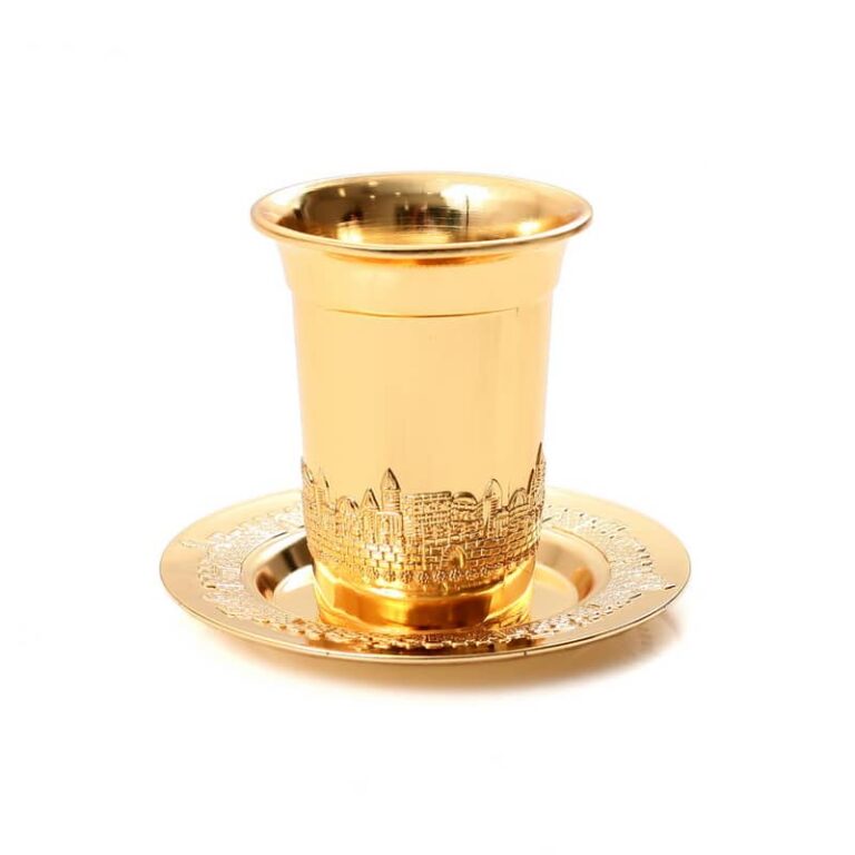 GOLD PLATED JERUSALEM KIDUSH CUP WITH SAUCER