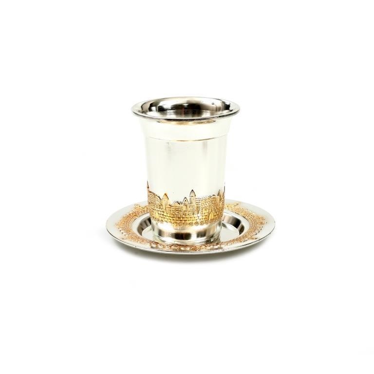 SILVER/GOLD PLATED JERUSALEM KIDUSH CUP WITH SAUCER