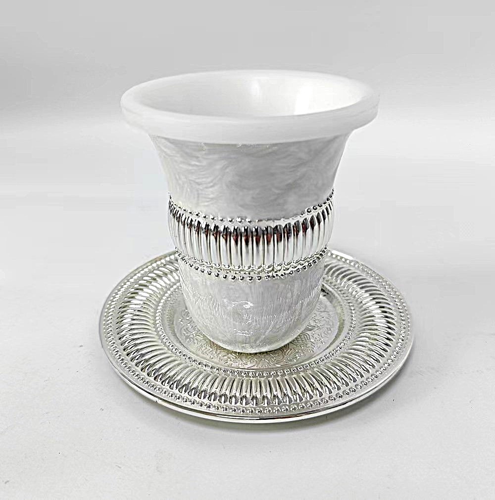 SILVER PLATED/WHITE ENAMEL KIDDUSH CUP/STEM/SAUCER