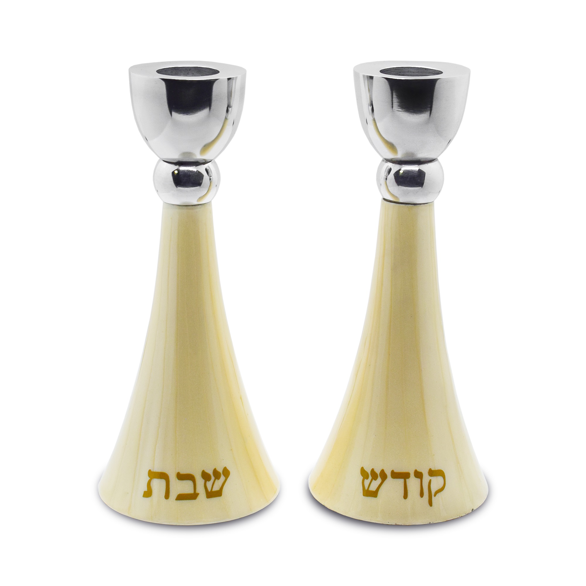ALUMINIUM CREAM/SHABBAT KODESH PAIR CANDLESTICKS 17 CM.