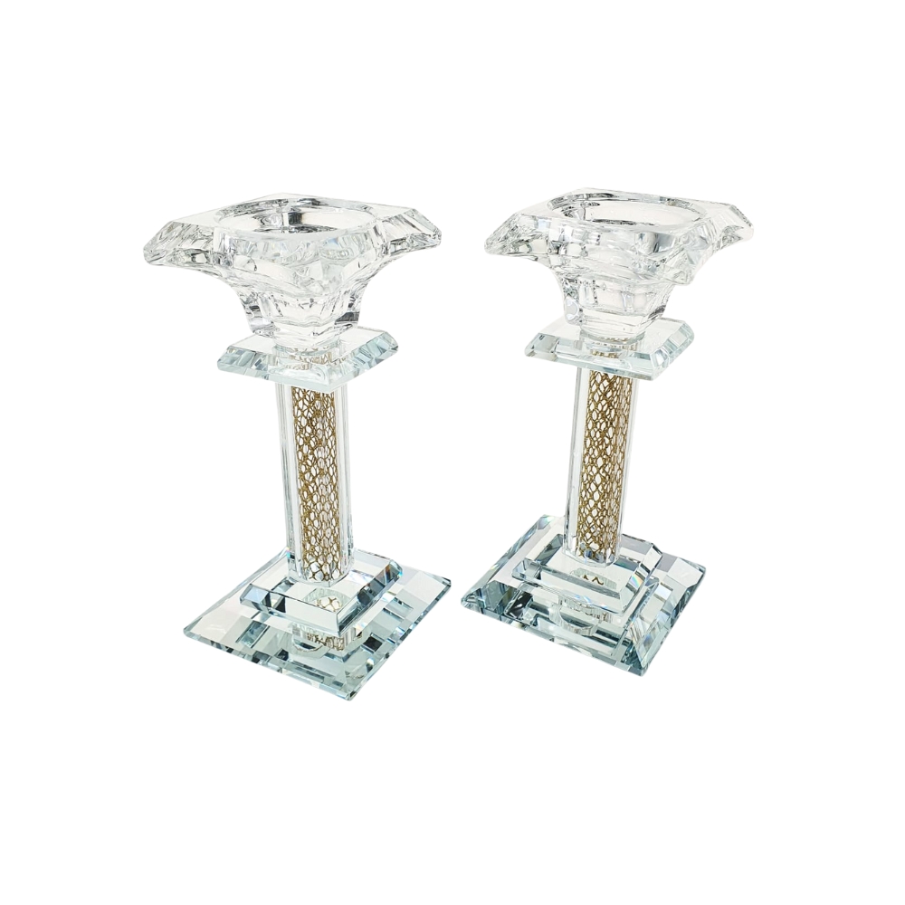 CRYSTAL/GOLD SPOOL SQUARE PAIR CANDLESTICKS 15 CM.
