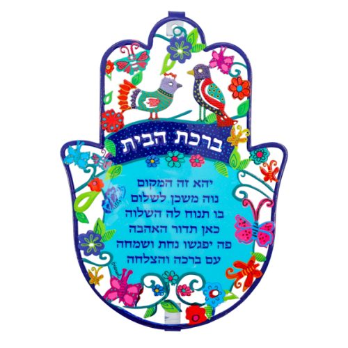 FLAT LARGE ENAMEL LACQUER BIRDS/HEBREW HOME BL. HAMSA