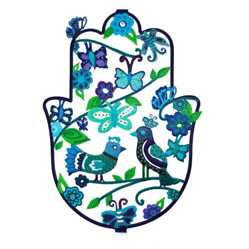 FLAT LARGE BLUE ENAMEL LACQUER BIRDS AND FLOWERS HAMSA
