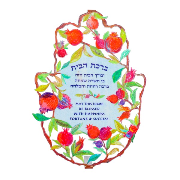 / FLAT LARGE ENAMEL LACQUER POMEGRANATES/ENG./HEB.H.BL HAMSA