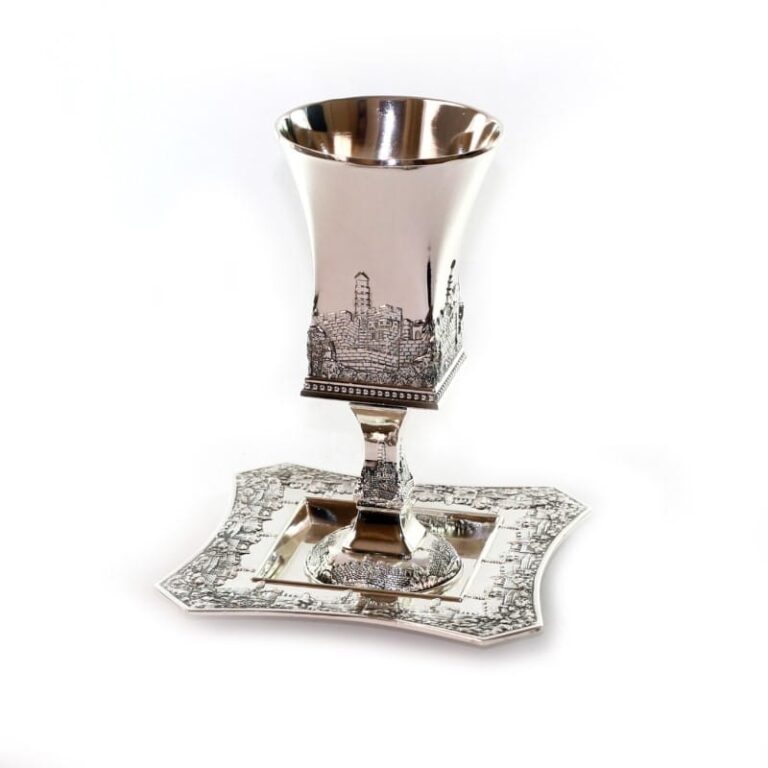 SILVER PLATED JERUSALEM KIDUSH CUP WITH STEM AND SAUCER
