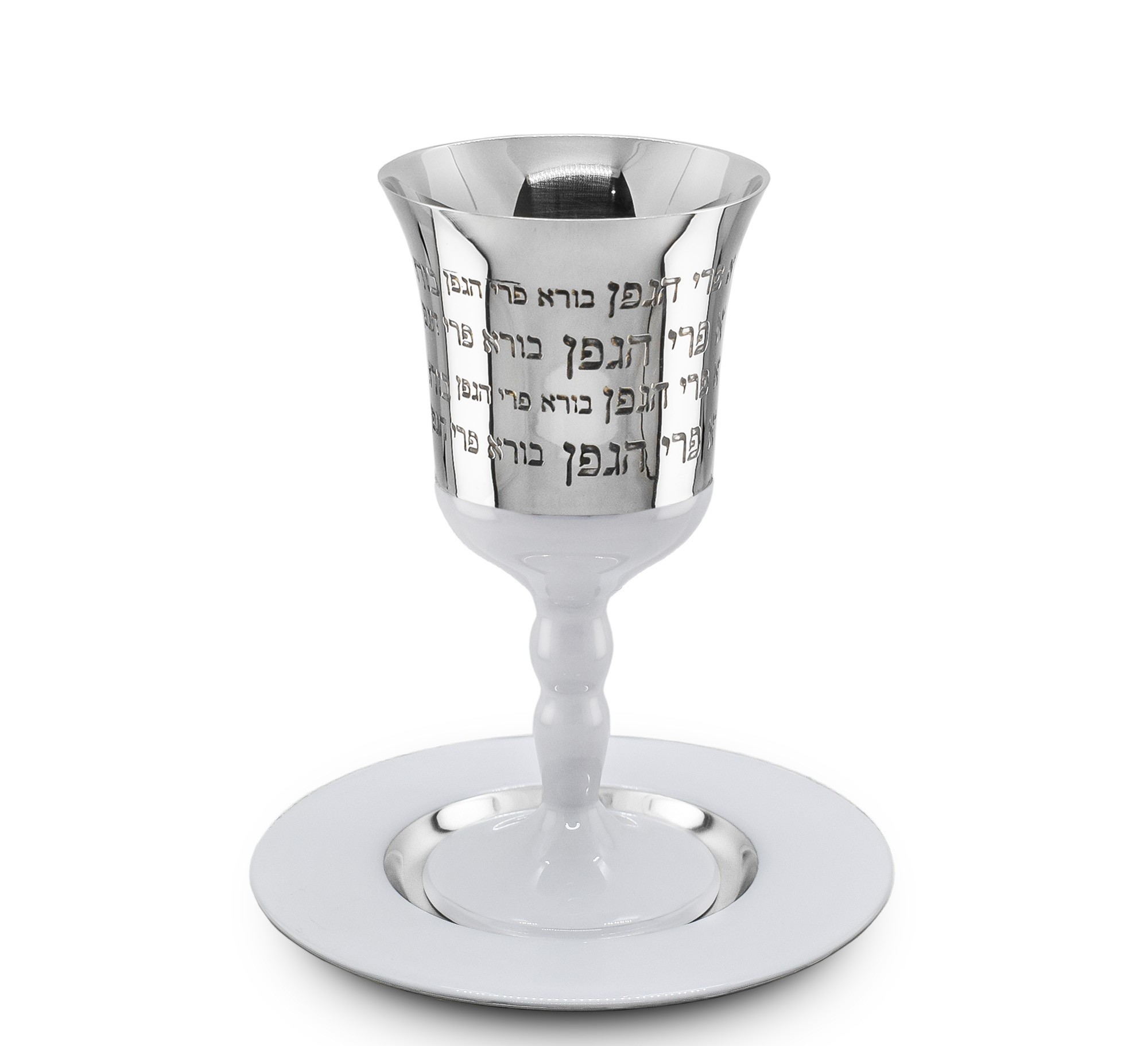 GREY ENAMEL “BORE” ETCHING KIDDUSH CUP/STEM/SAUCER