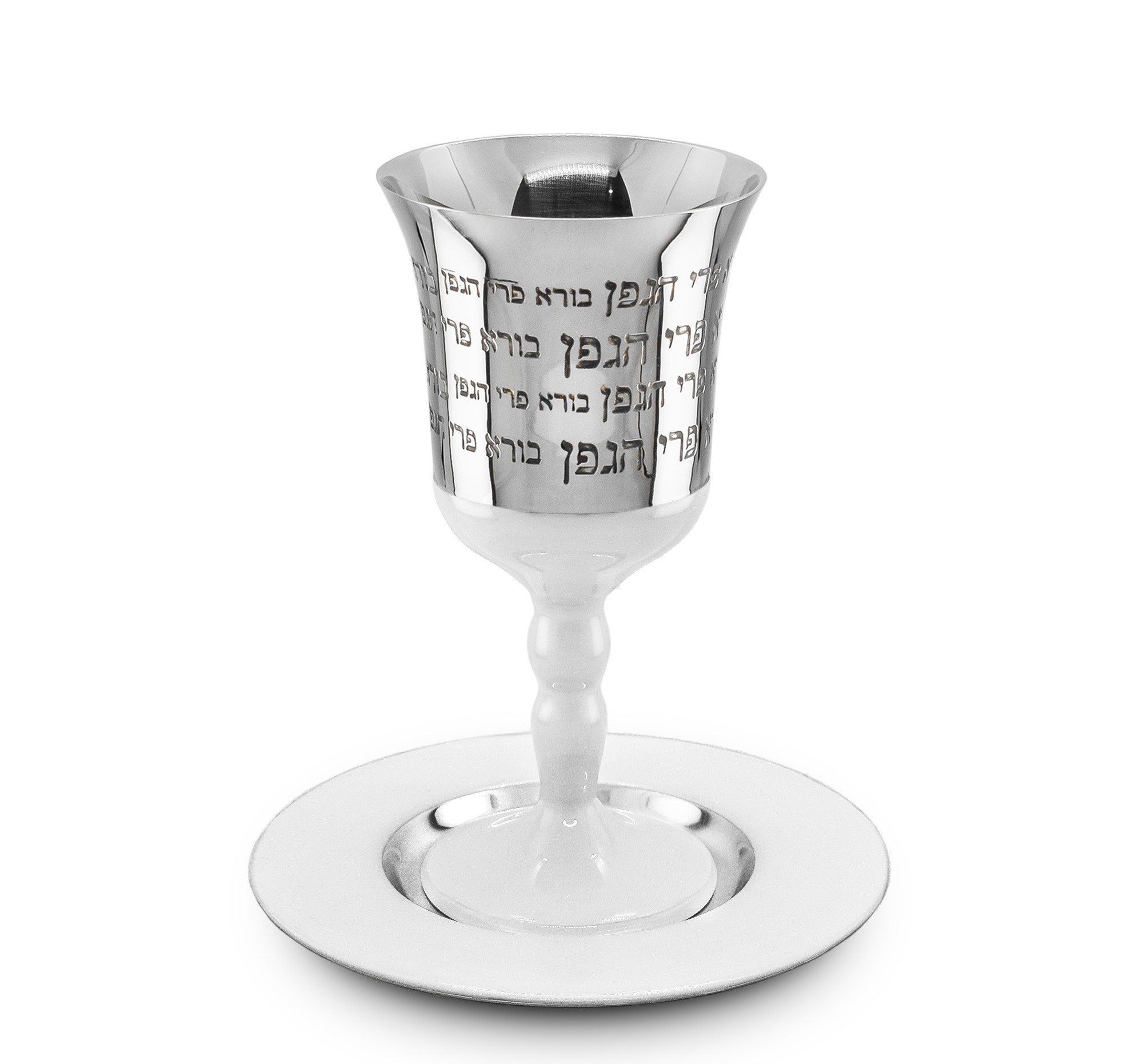 WHITE ENAMEL “BORE” ETCHING KIDDUSH CUP/STEM/SAUCER