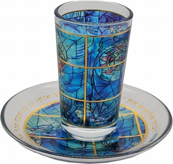 GOLD ETCHING BLUE TONES SHAGAL KIDDUSH CUP/SAUCER