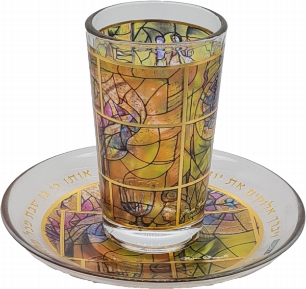 GOLD ETCHING YELLOW TONES SHAGAL KIDDUSH CUP/SAUCER