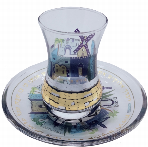 SILVER/BL. TONES ETCHING JERUSALEM KIDDUSH CUP/SAUCER
