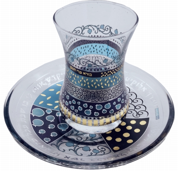 SILVER/BL. TONES ETCHING KIDDUSH CUP/SAUCER