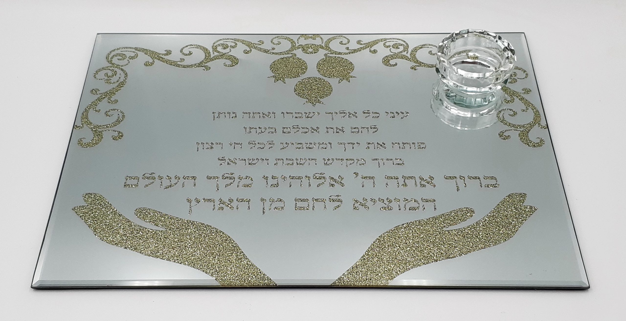 KIDUSH TRAY GLASS+BLES.MIRROR GOLD.DEC.+SALT DISH