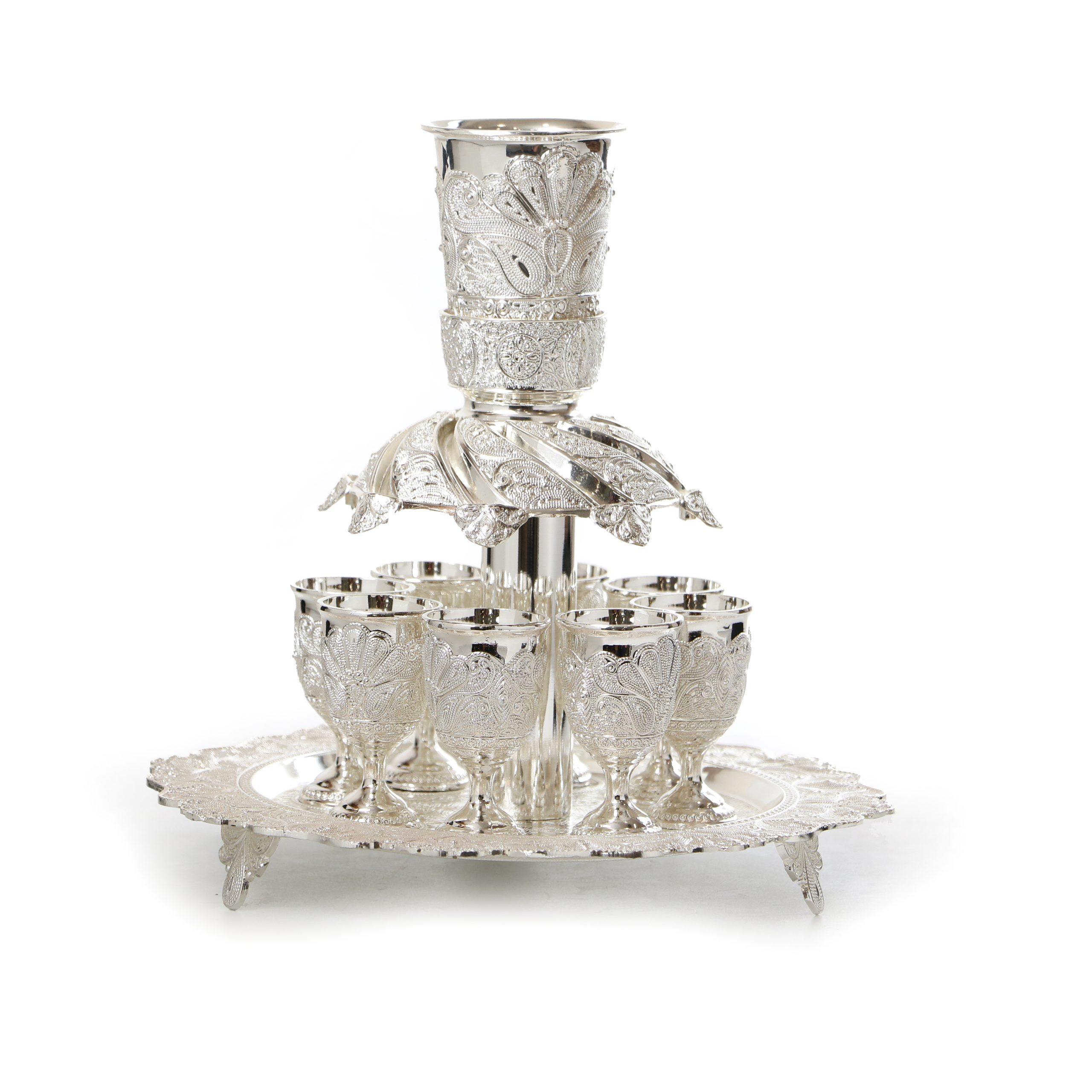 SILVER PLATED FILIGREE WINE DIVIDER W/8 SMALL CUPS & TRAY