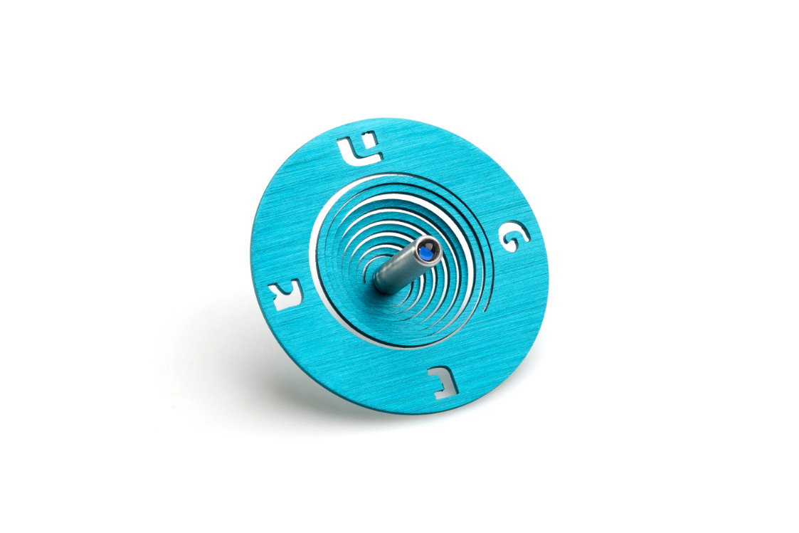 ALUMINUM TURQUOISE “SPOOL” DREIDEL ON STAND