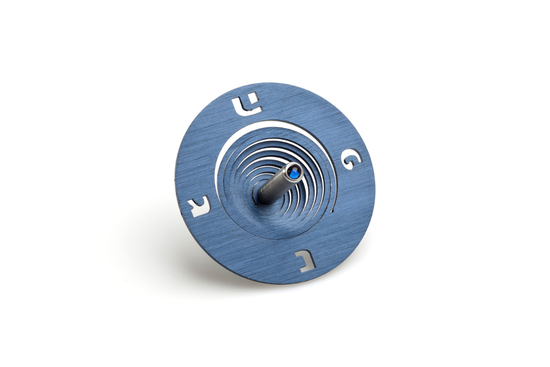 ALUMINUM BLUE “SPOOL” DREIDEL ON STAND