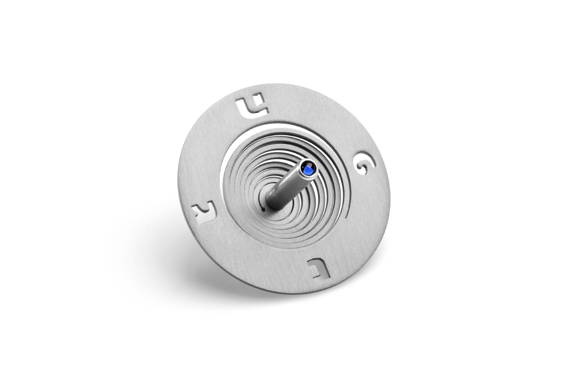 ALUMINUM SILVER “SPOOL” DREIDEL ON STAND