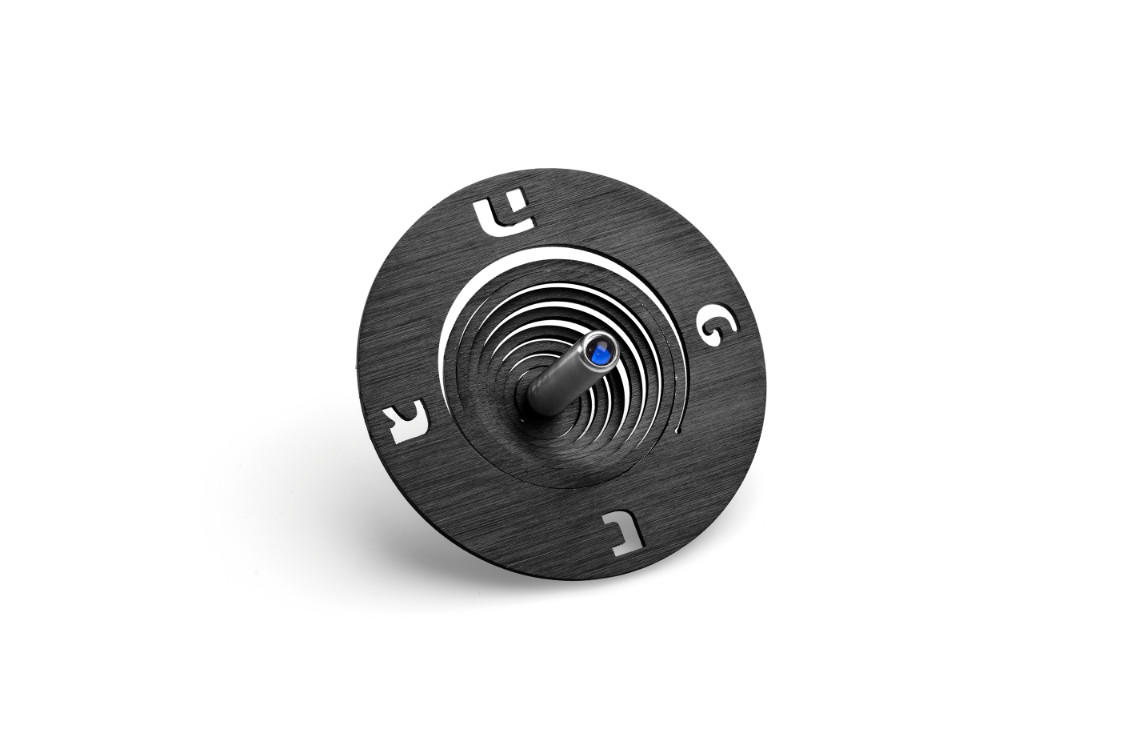 ALUMINUM BLACK “SPOOL” DREIDEL ON STAND