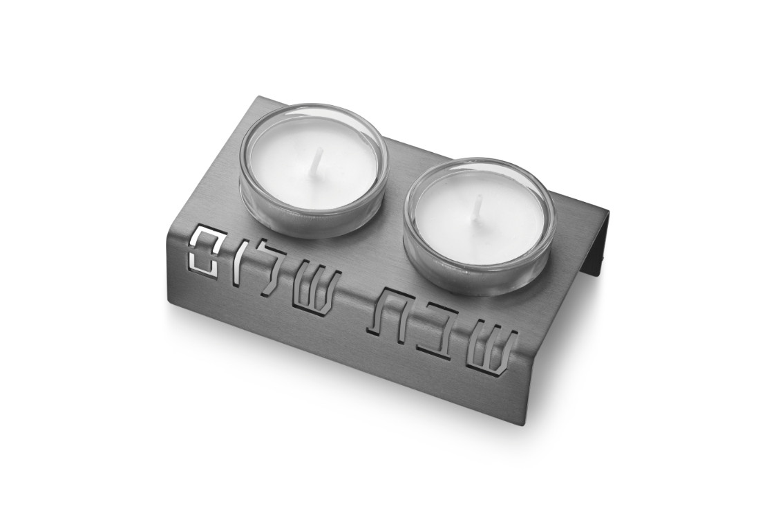 ALUMINUM GREY “SHABBAT SHALOM” CANDLESTICK