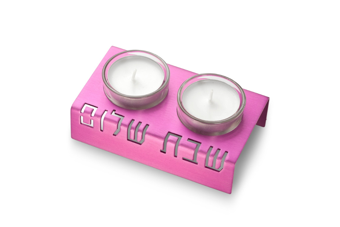 ALUMINUM PINK “SHABBAT SHALOM” CANDLESTICK