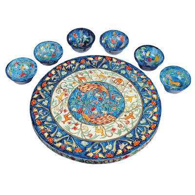 SEDER PLATE/6 BOWLS PEACOCKS HAND PAINTED 33 CM.